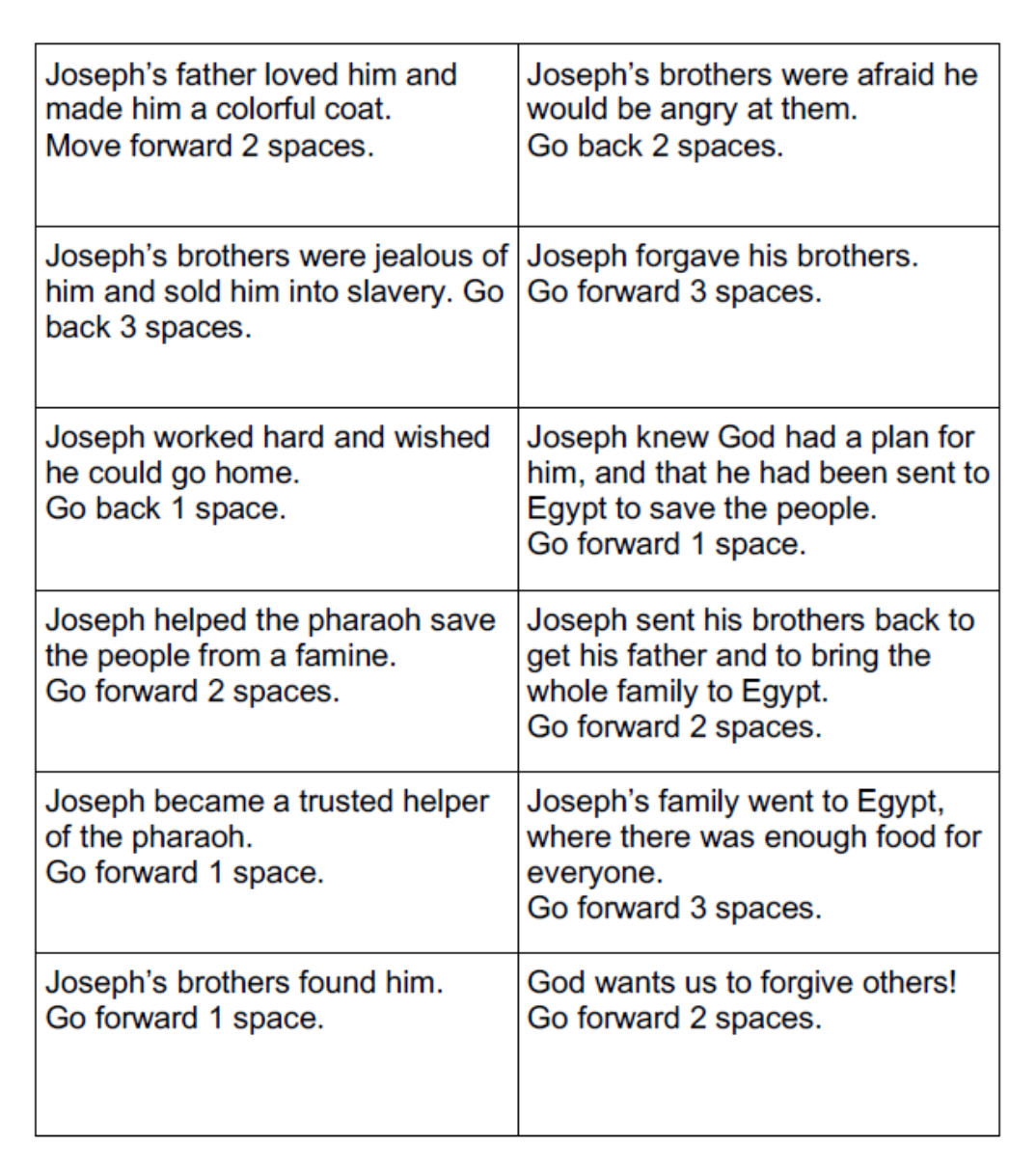 - study Joseph’s story through playing a board game.